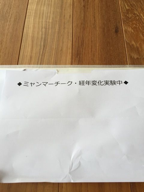2015.01.31店長ブログ ミャンマーチークの日焼け経年変化実験 日記 ミャンマーチークの経年変化実験を本社ショールームで行っています。 チークフローリングは日の光に当たると経年変化によりゴールデンチークカラーに変化します。 こちらの右が「日焼け前」、左が日焼け後。 上の写真はインドネシアチークですが、ミャンマーチークも日焼けの経年変化を実験してみました。 数か月後が楽しみです。 Related posts: 渋谷109に浜崎あゆみがきました! オスモのショールームに行ってまいりました。 厦門のおみやげ。 杉の家具展が銀座で開催されています。